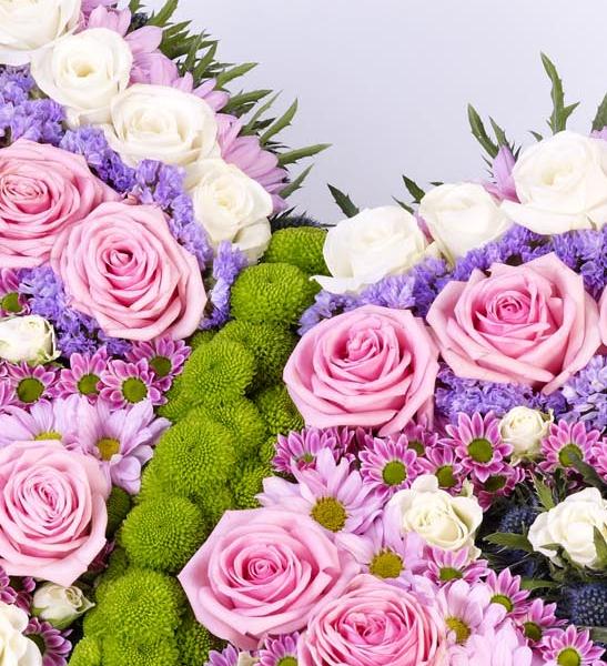 An array of pinks, lilacs, lime green and white make up this beautiful butterfly-shaped floral tribute. The display features spray chrysanthemums, pink and white roses, blue eryngium, lilac statice and lime green spray chrysanthemums.