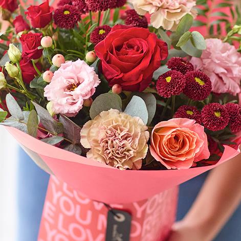 A gorgeous mix of romantic blooms, exquisitely arranged by an artisan florist and safely tucked in a beautiful giftbox. It'll feature blooms in classic Valentine's colours including cerise, burgundy and soft pink.
