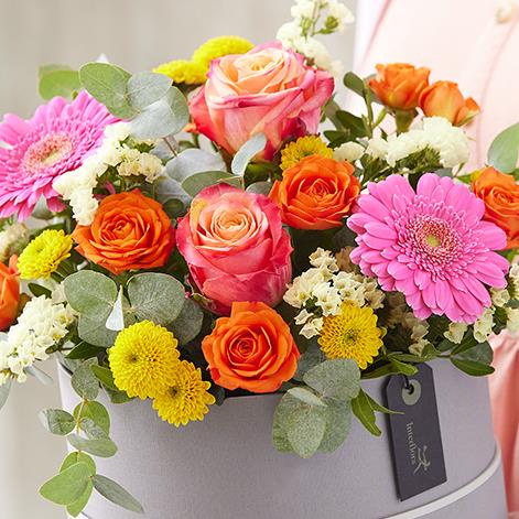 Forget hats, this hatbox is for beautiful, bright blooms! Crafted by hand by a local florist, this lovely display of vibrant flowers will bring all sorts of colour to mum's day.