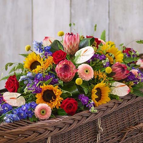 Tropical blooms in vibrant shades, including protea and anthurium, meet lush foliage and sunflowers in this beautiful casket spray.