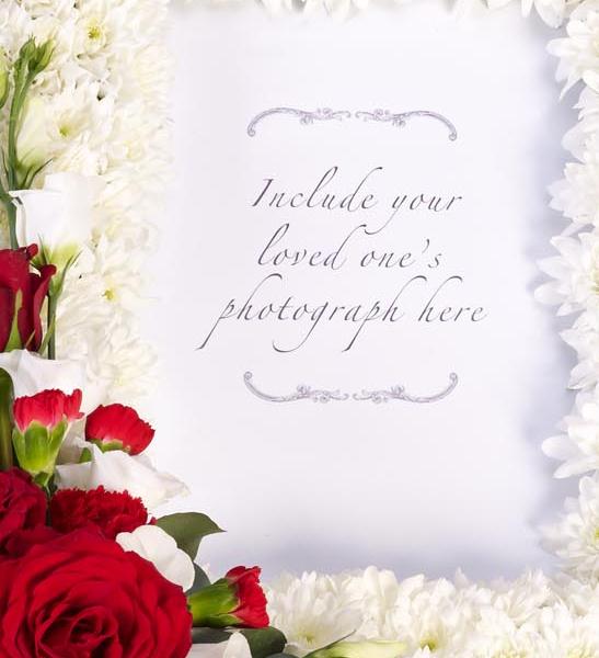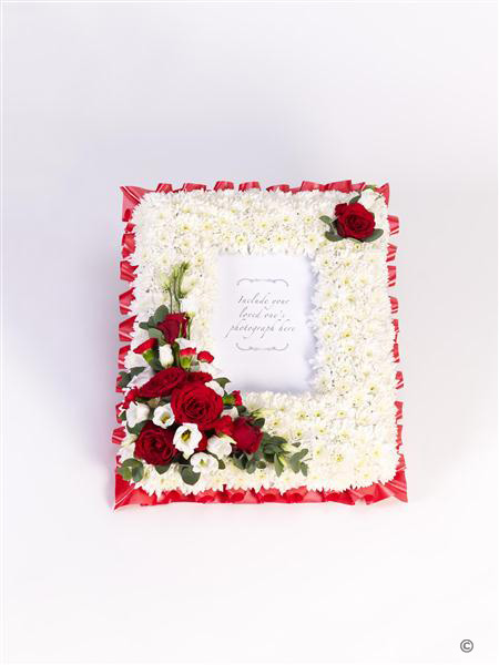 This very personal floral tribute features a photo of your loved one surrounded by a frame of fresh flowers. An abundance of white double spray chrysanthemums are contrasted with red short Stem roses, red spray carnations and white lisianthus, trimmed with eucalyptus and finished with ribbon.