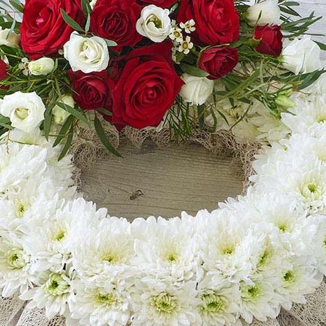 A traditional wreath of white chrysanthemums contrasted with a cluster of pretty roses, lisianthus and delicate foliage.
