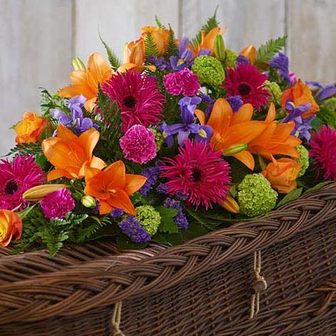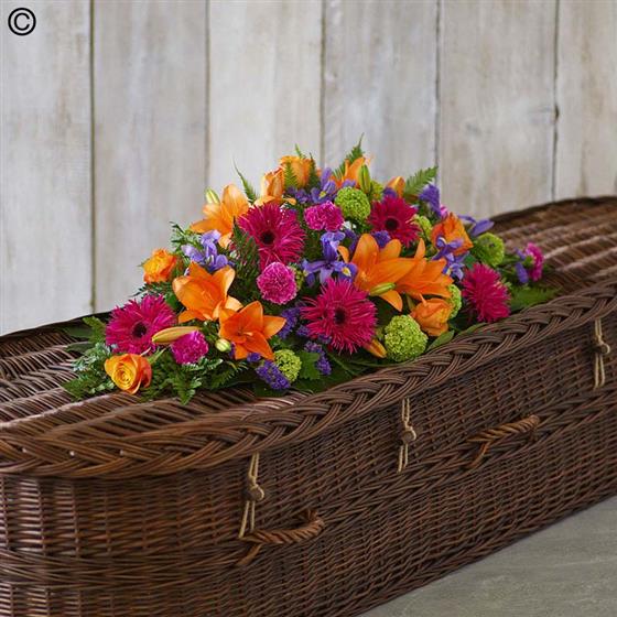 A casket spray of beautifully bright blooms including cerise carnations, orange roses and striking orange lilies.
