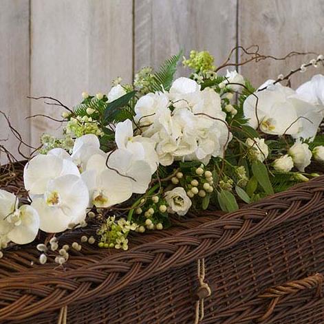Made using natural branches (with no floral foam) this tribute will naturally break down after the service. It features beautiful white orchids, hydrangeas, and astrantia.